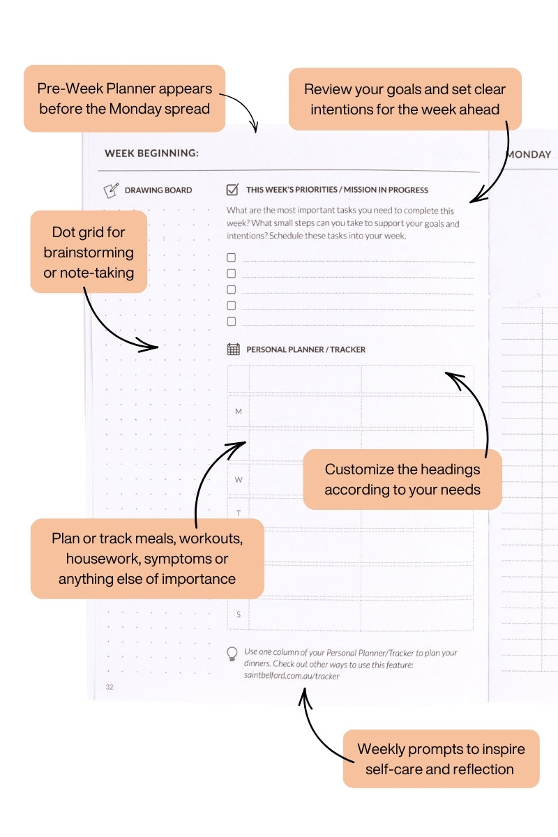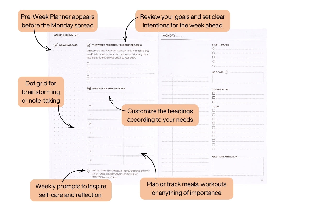 Single-Page Pre-Week Planner: Prepare for the week ahead by reviewing your goals, identifying top priorities, and setting clear intentions.