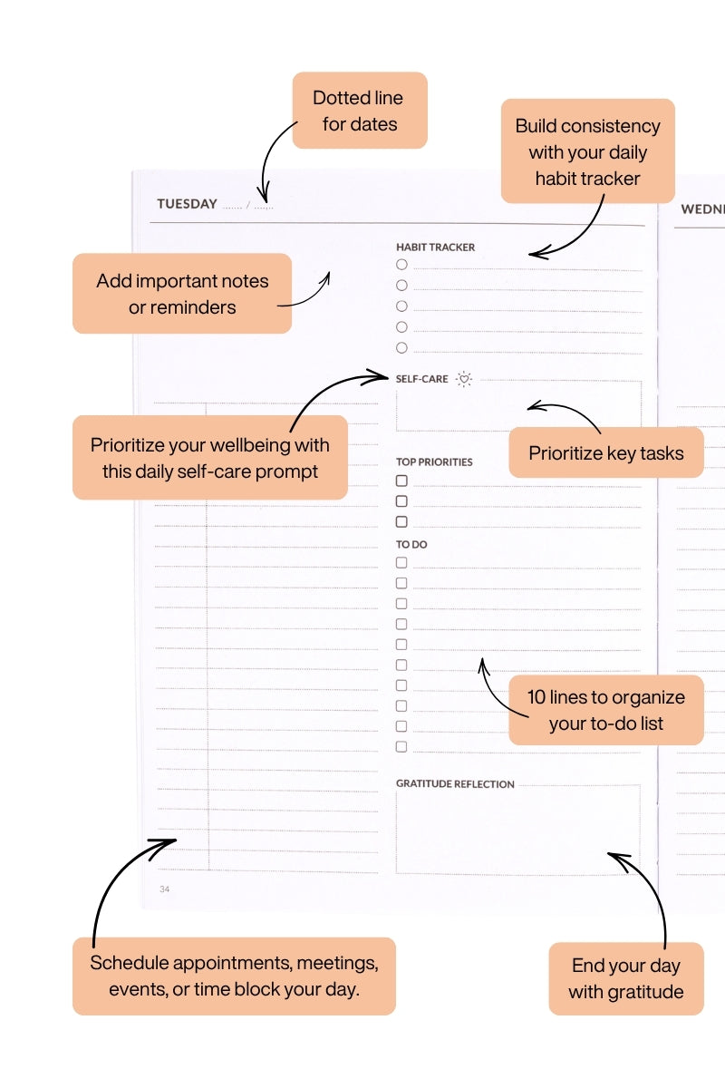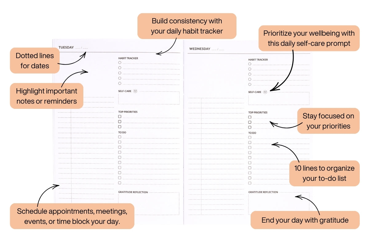 Daily spread layout: Generous space to organize your to-do list and schedule each day.