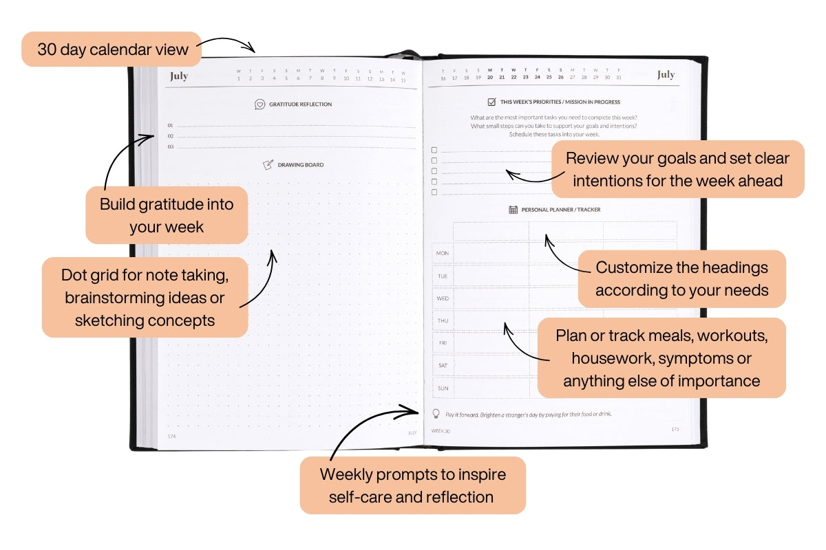 Monthly Planner (double page spread): View each month at a glance and mark important dates. Monthly spreads are grouped together at the beginning of your planner for easy access.