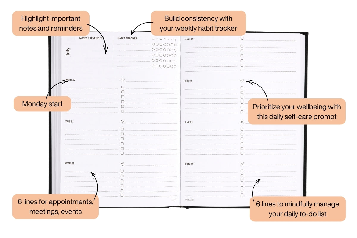Weekly spread layout: Generous space to organize your to-do list and schedule for the week ahead.