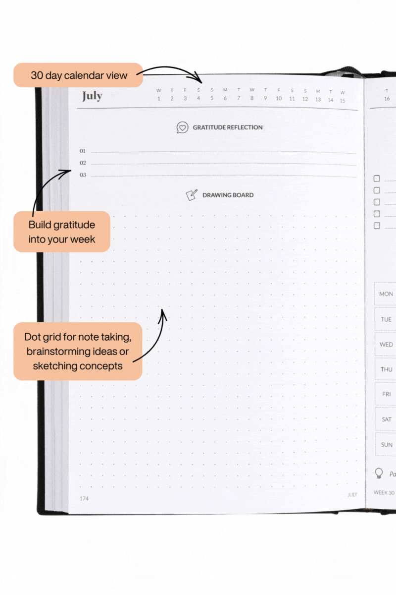 Weekly Drawing Board (Dot Grid): Take notes, brain dump, sketch, or capture ideas on your built-in notepad.