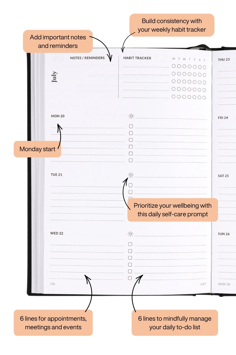 Our signature Pre-Week Planner and Weekly Spread layout gives you four planning pages per week to organize all areas of your life.