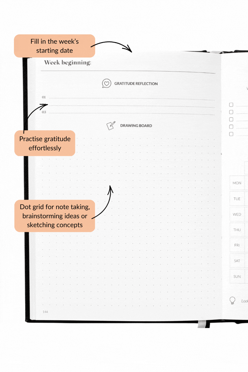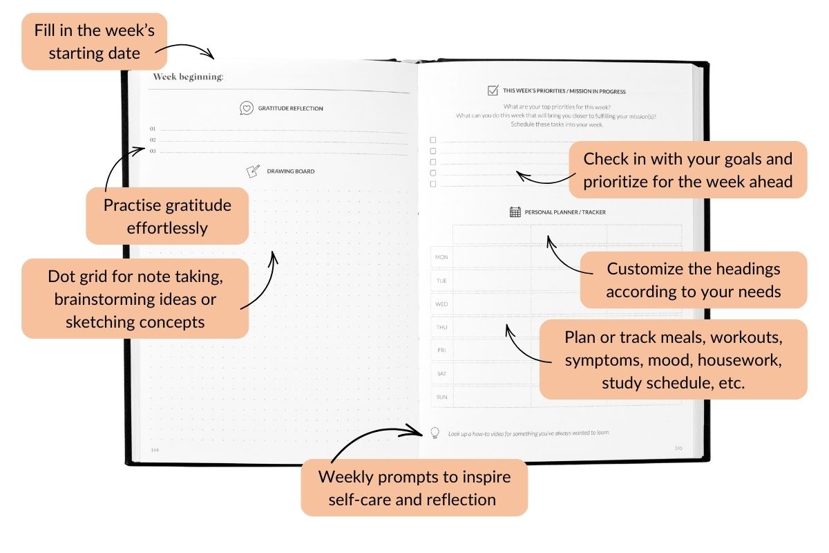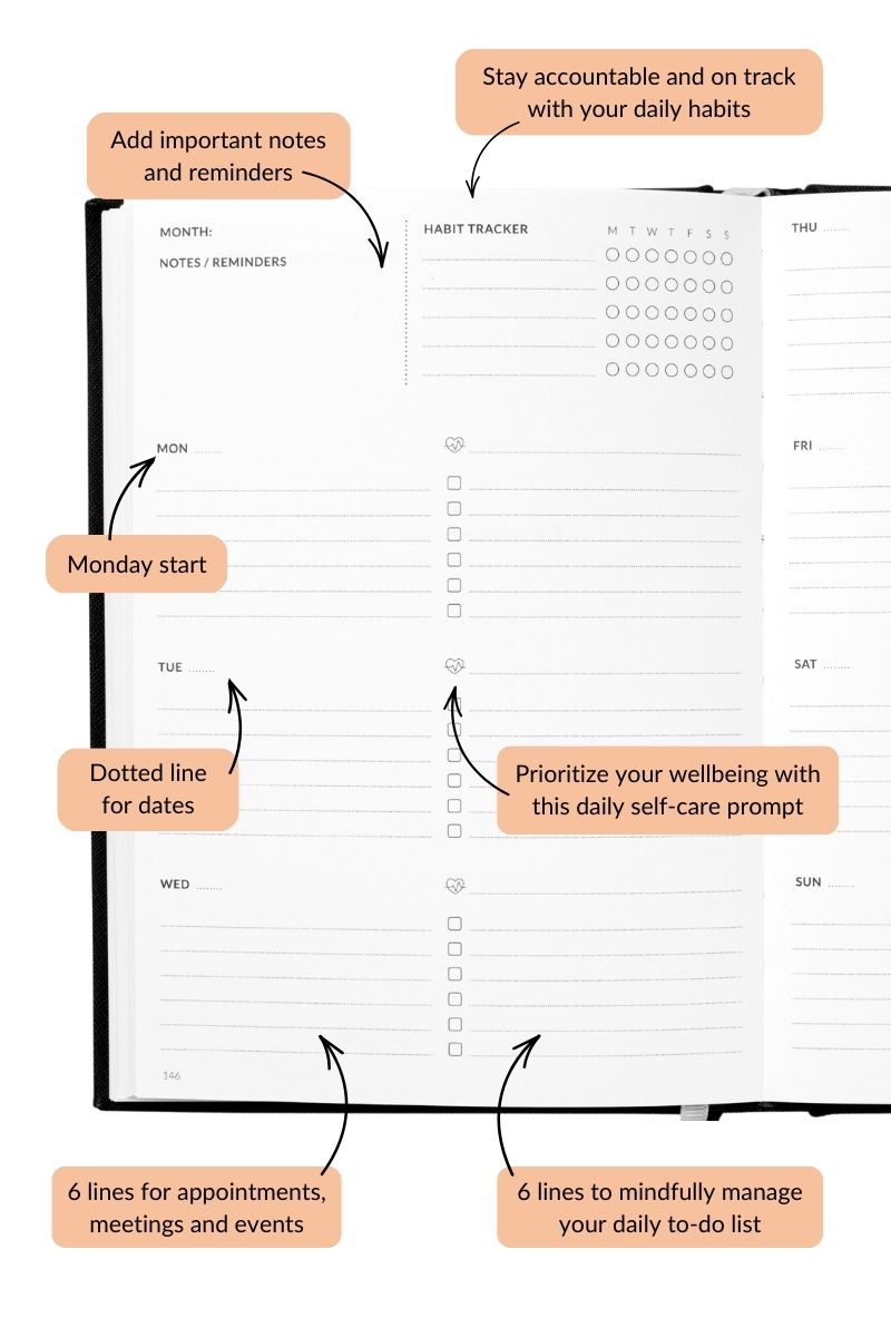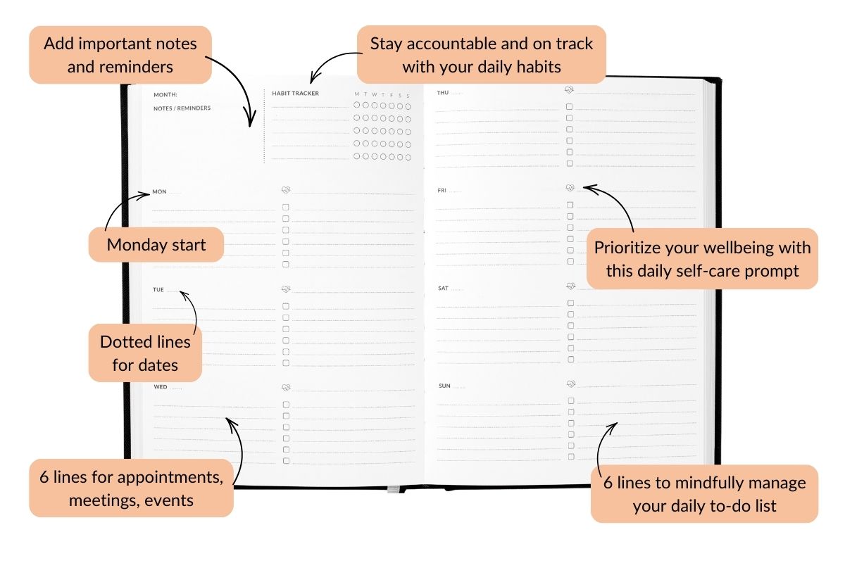 Our unique Pre-Week Planner and Weekly Spread layout gives you four planning pages per week to organize all areas of your life.